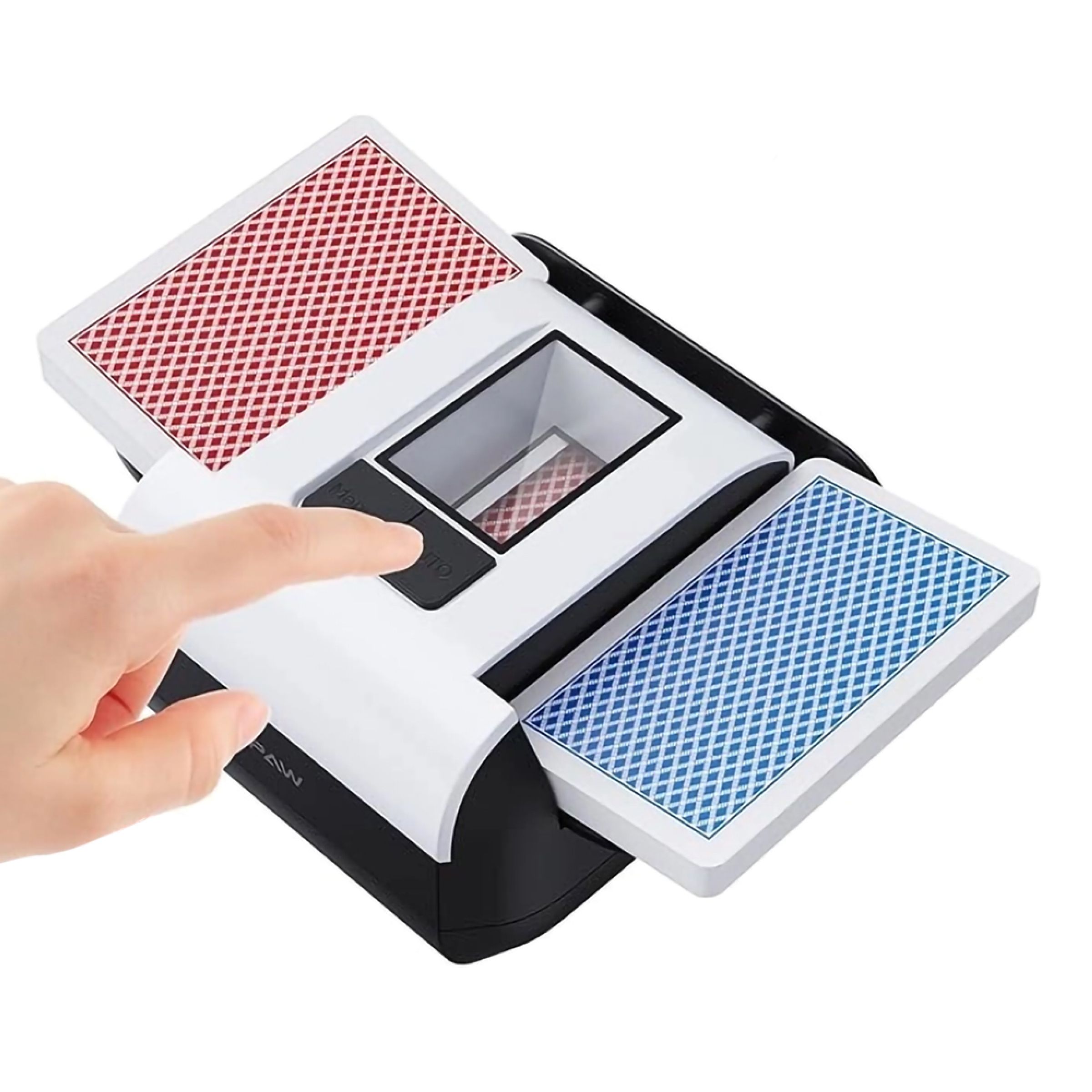 Kortblandare är en kortblandare som blandar upp till 2 kortlekar i både bridge och pokerstorlek. Den har två knappar, en för manuell blandning där maskinen stannar när knappen släpps, och en för automatisk blandning som styrs av inbyggda sensorer. Kortblandaren har inbyggt batteri som laddas via USB C och kabel ingår.