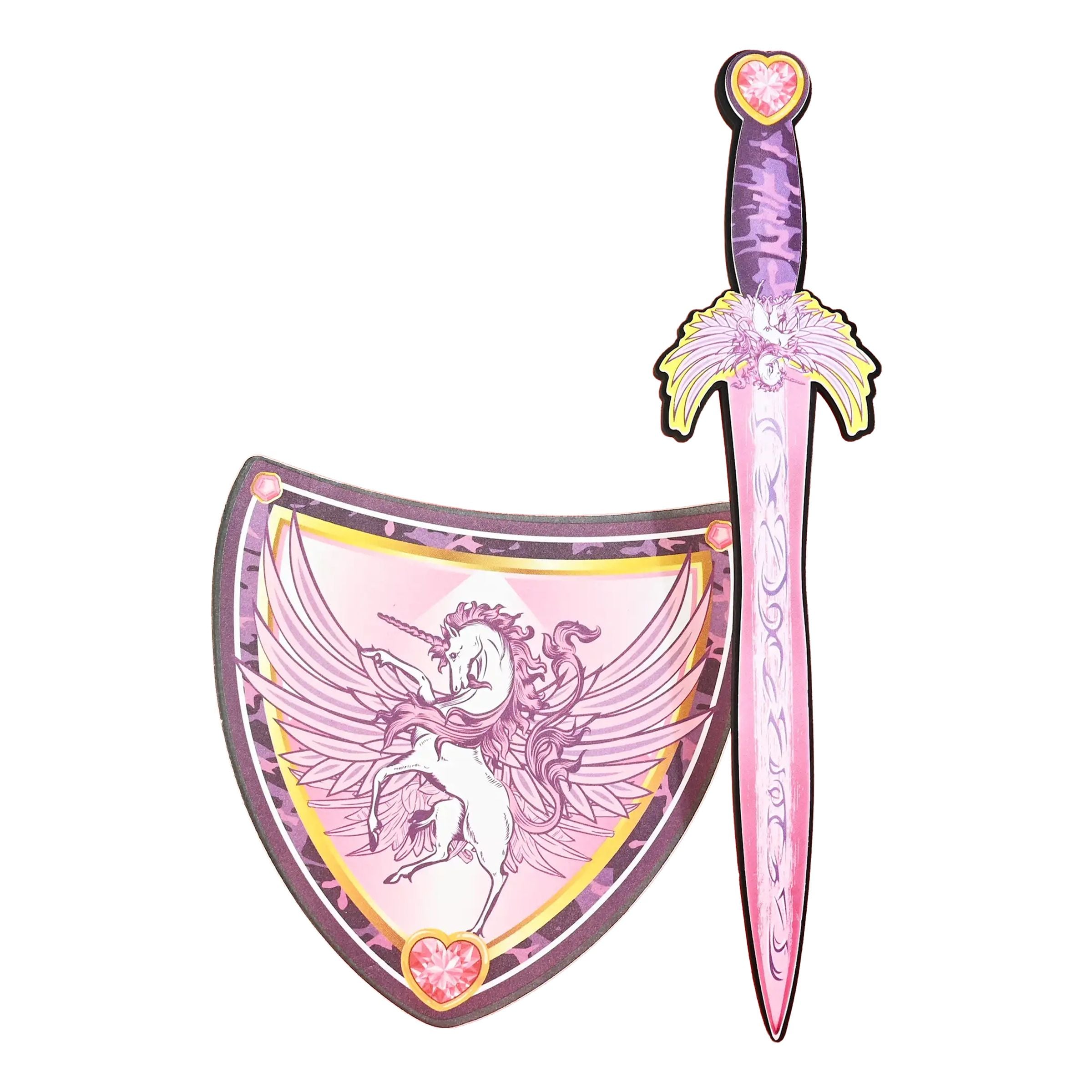 Mjukt Svärd & Sköld Enhörning för Barn består av ett lätt och lekvänligt svärd samt en matchande sköld i rosa och lila nyanser. Båda delarna är dekorerade med motiv av en bevingad enhörning, gnistrande detaljer och hjärtformade ornament som ger en sagolik känsla. Tillverkade i mjukt gummimaterial som gör leken både säker och bekväm.