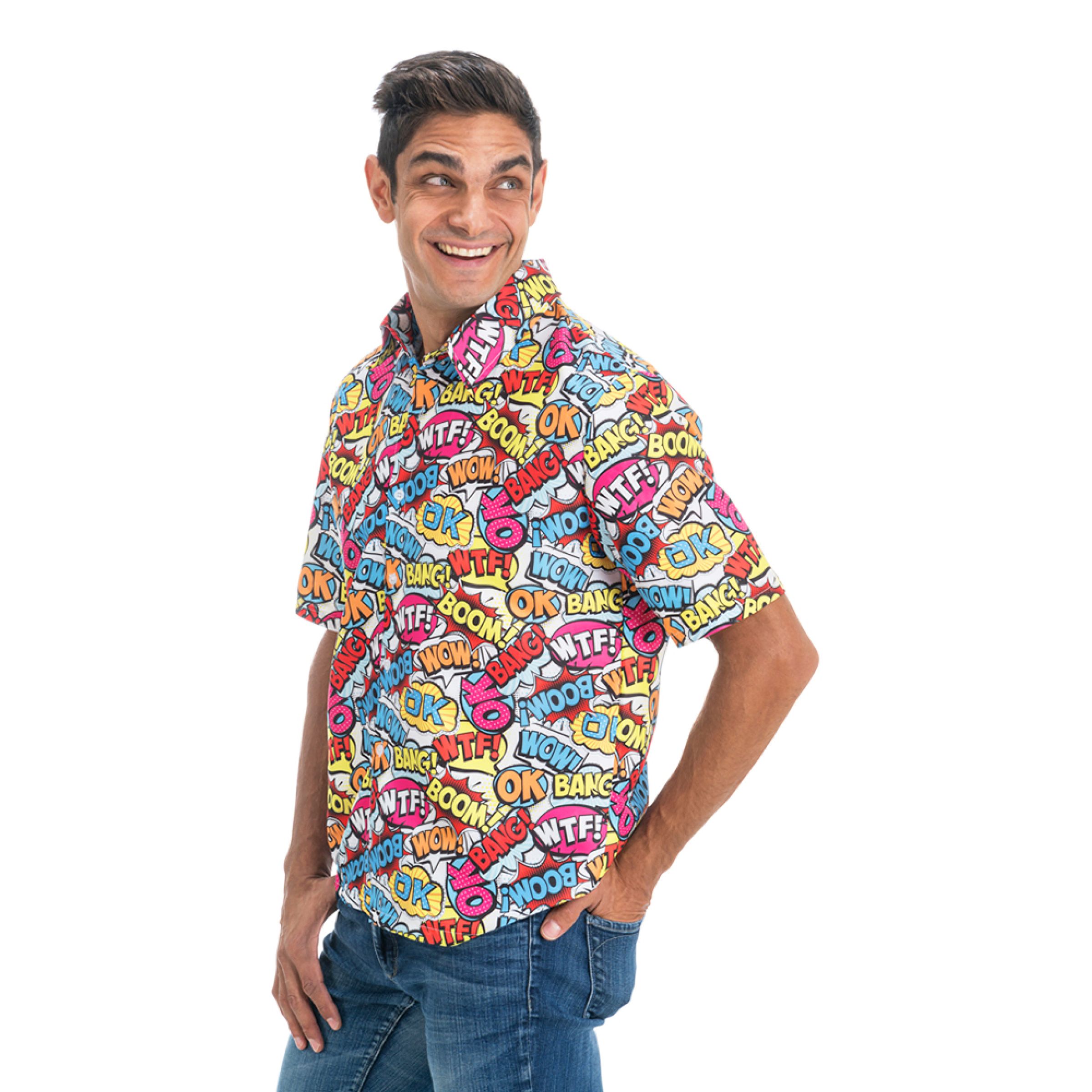 Skjorta 90’s Retro Comic är en kortärmad skjorta med färgstarkt serietidningsmönster i tydlig 90-talsstil. Ett givet val till 90-talsfesten, men funkar minst lika bra så fort vardagen behöver kännas lite mer retro och rolig.